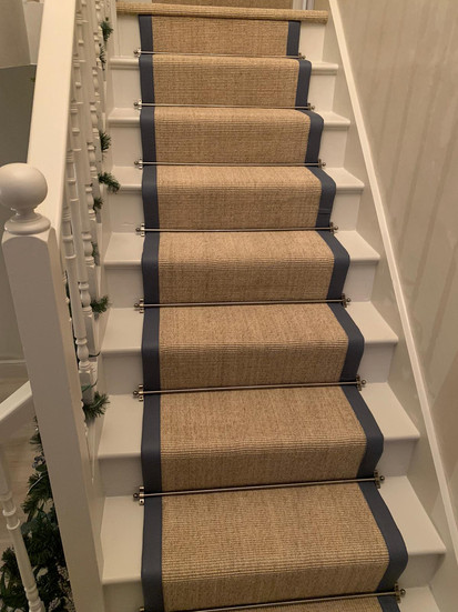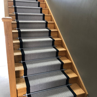 Pinned Under Nosing's - Where the carpet is pulled tight around the form of the nosing and pinned on the underside of the lip so that the carpet lies flat against the riser. This upholstered method works well with flatweave and sisal carpets, but means additional length is needed on the carpet in order to wrap each nosing.