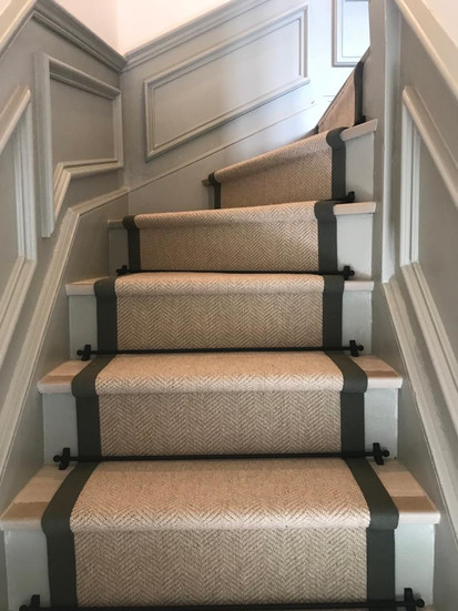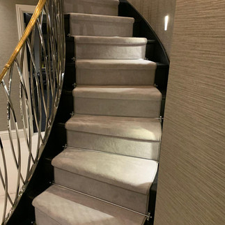 The alternative to this is to shape the runner to continue along half landings and quarter turns so that the runner is uninterrupted from top to bottom. This method always requires two visits from the fitters as they have to cut and shape the runner on site prior to the runner edging being finished, so it is often more costly: